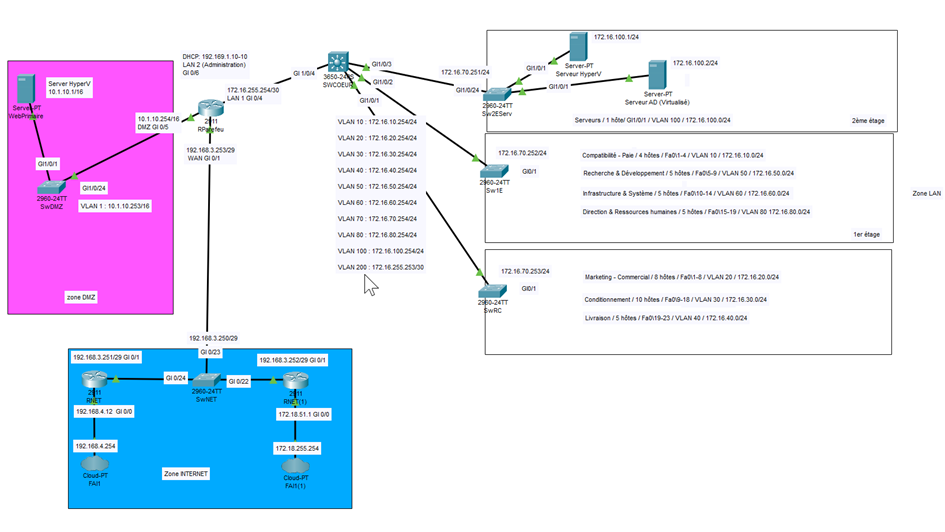 Le projet consiste à mettre à jour le schéma réseau pour inclure tous les éléments matériels et logiques, tout en configurant le pare-feu et le switch.