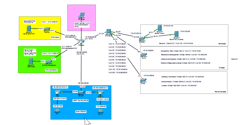L’architecture du système suivra les recommandations de l’ANSSI pour la répartition des services (web, base de données et FTP) dans les différentes zones du réseau. Actuellement, aucun proxy ou reverse proxy n’est déployé dans l’infrastructure